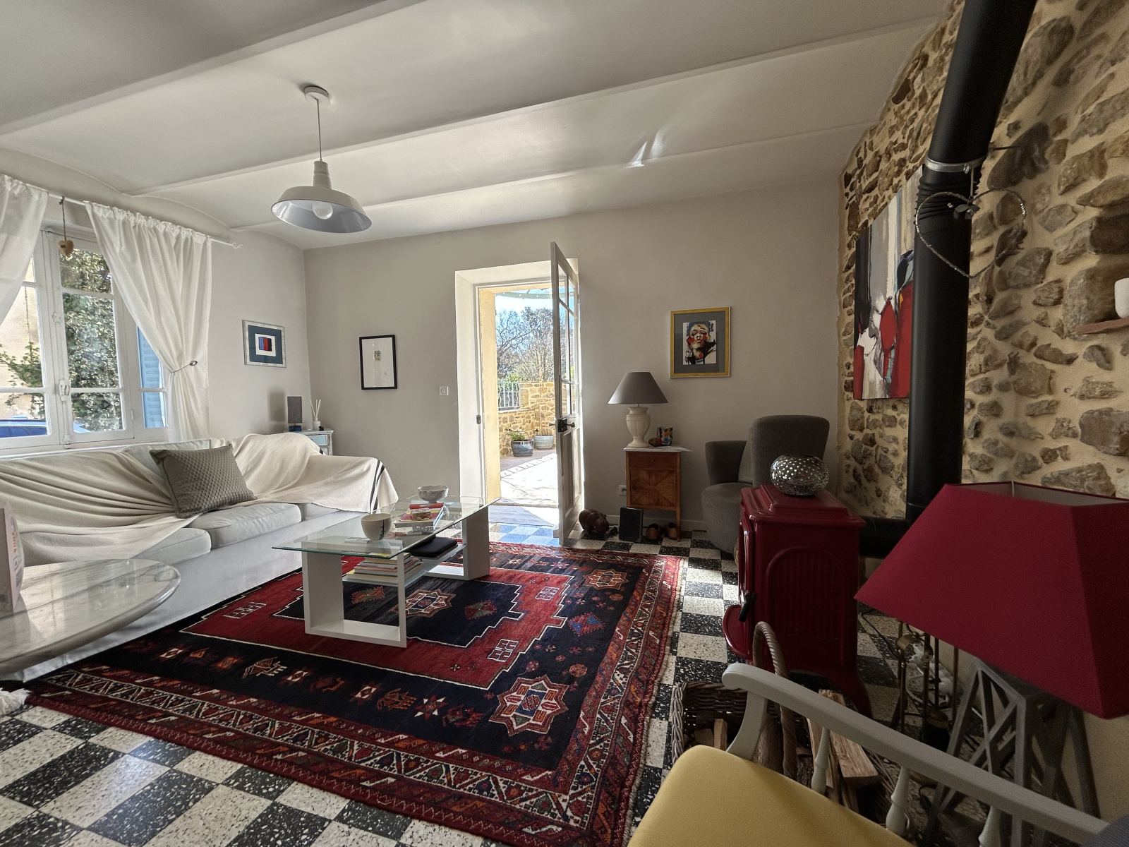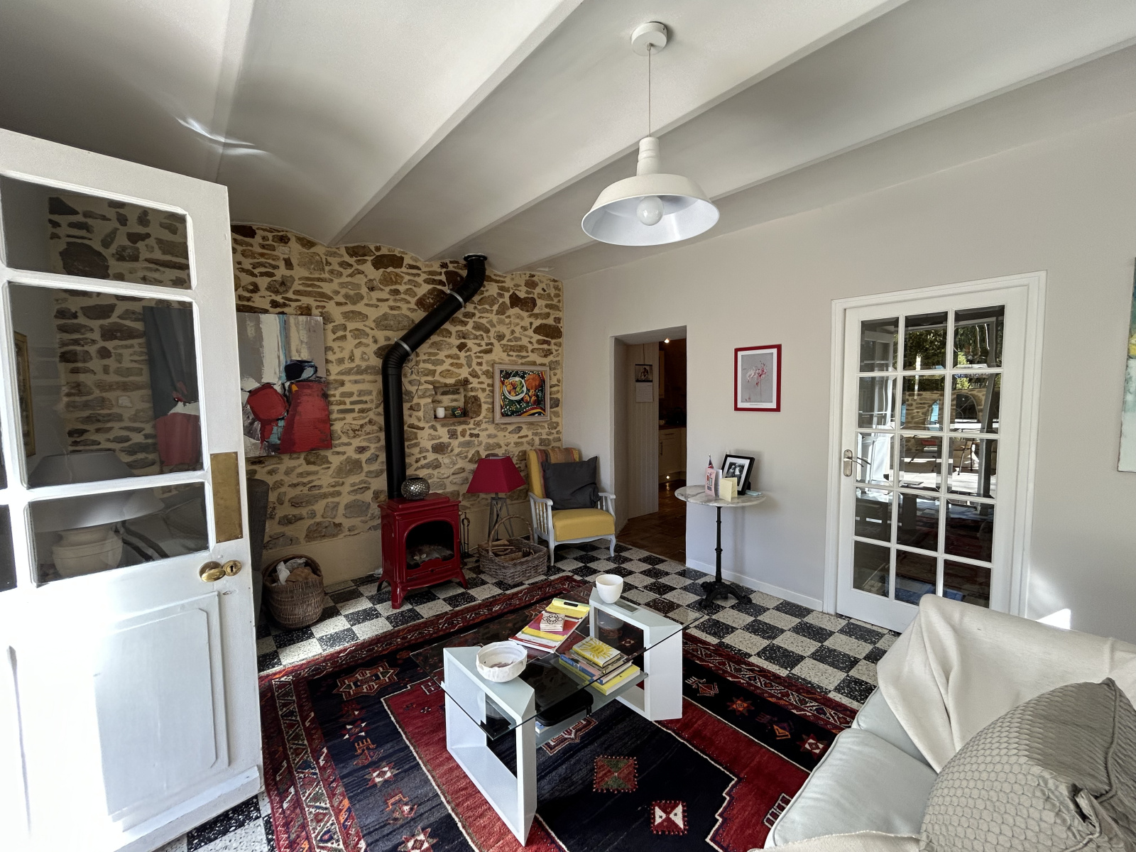 Plafond rampant et accès terrasse couverte EST.