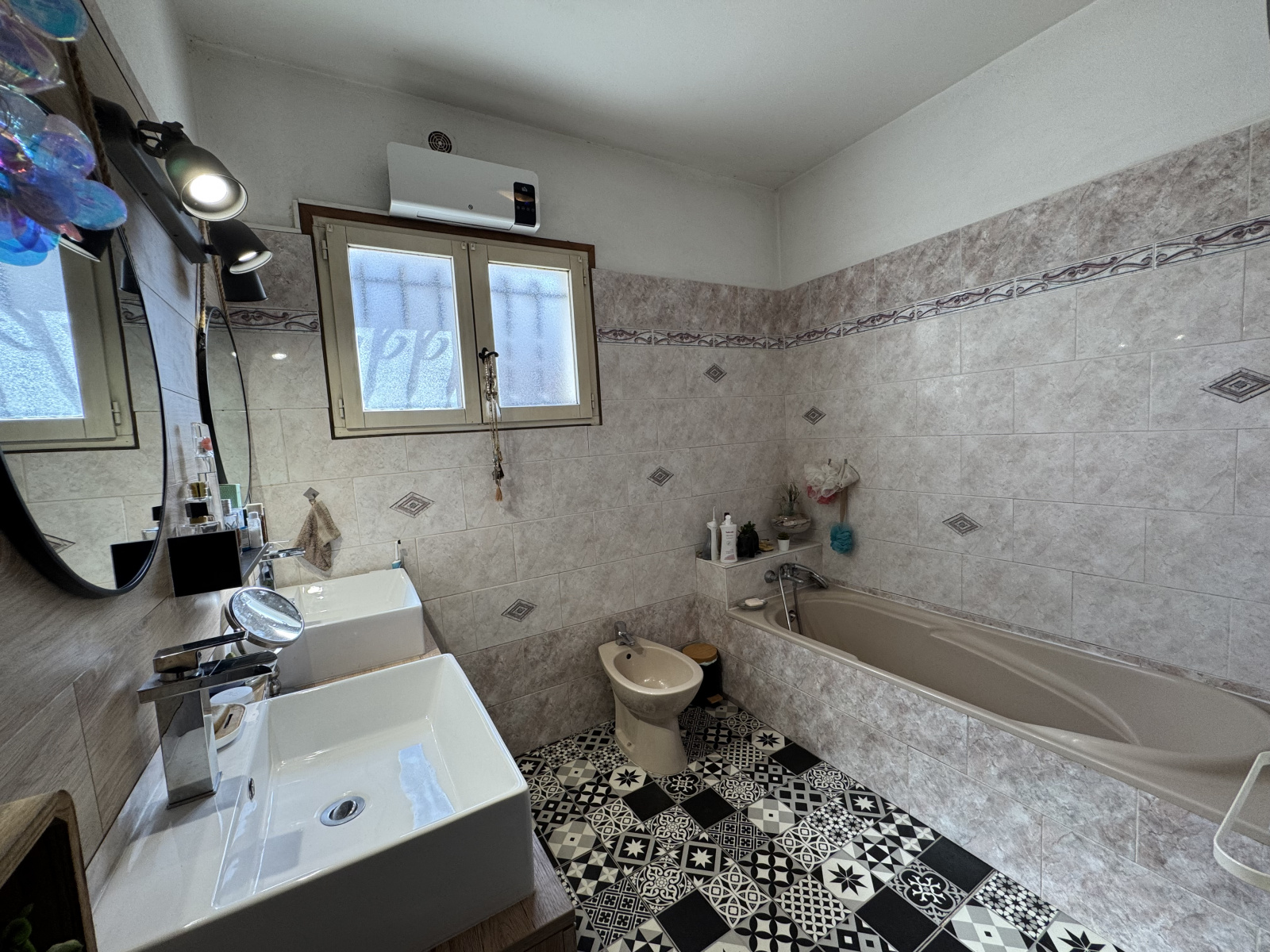 La maison comprend au rez-de-chaussée, une entrée de 7 m² avec placard, un grand séjour lumineux d'environ 70 m² avec cheminée et poutres apparentes, une cuisine ouverte et entièrement équipée donnant accès à la première terrasse de 20 m². Une buanderie proche de la cuisine, 2 chambres avec rangement de 13 m² et de 11.60 m², salle de bain avec double vasques et un wc séparé.