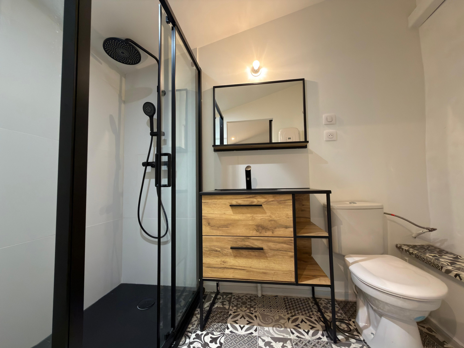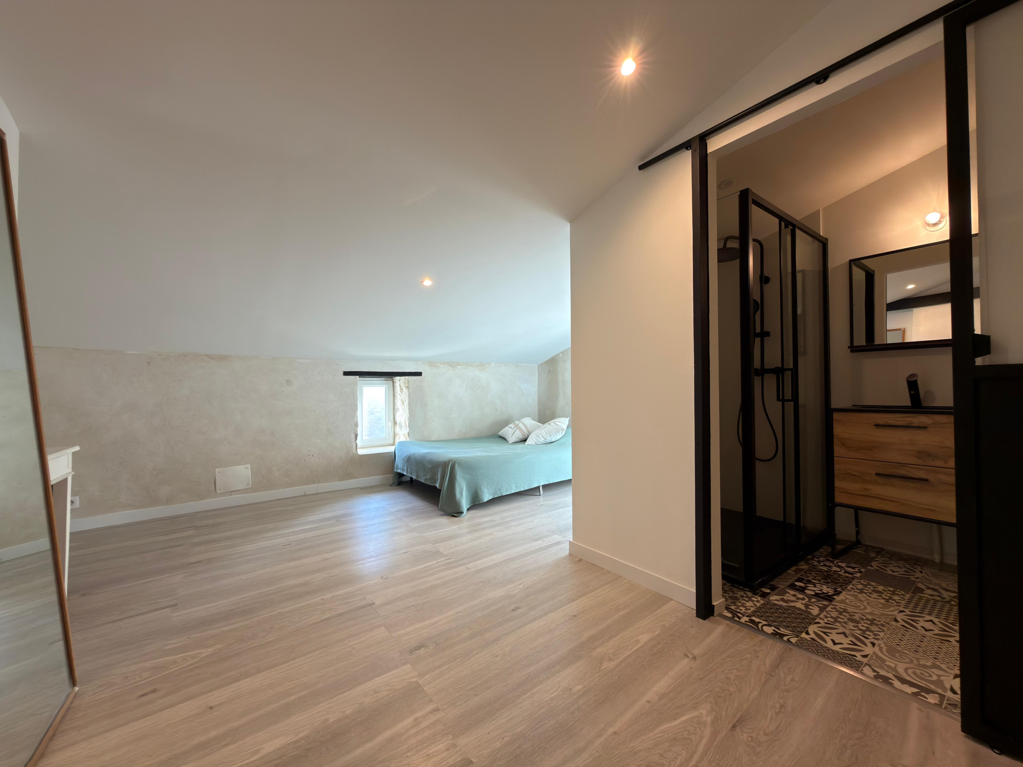 1er étage : une belle pièce de vie conviviale avec cuisine ouverte et équipée, salon chaleureux avec poêle à bois et climatisation réversible pour une surface de 37 m². 1 chambre et une salle d'eau avec WC.