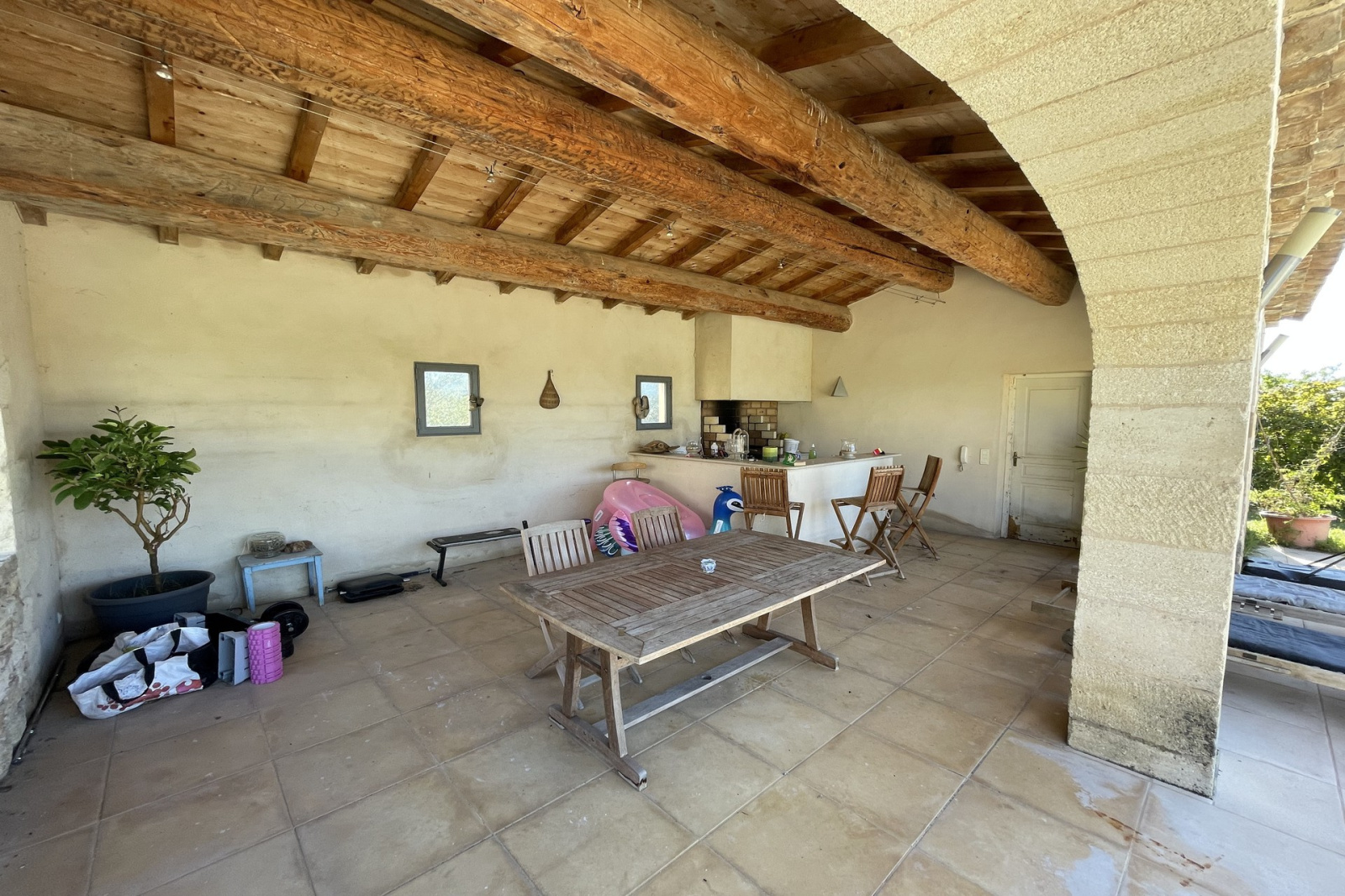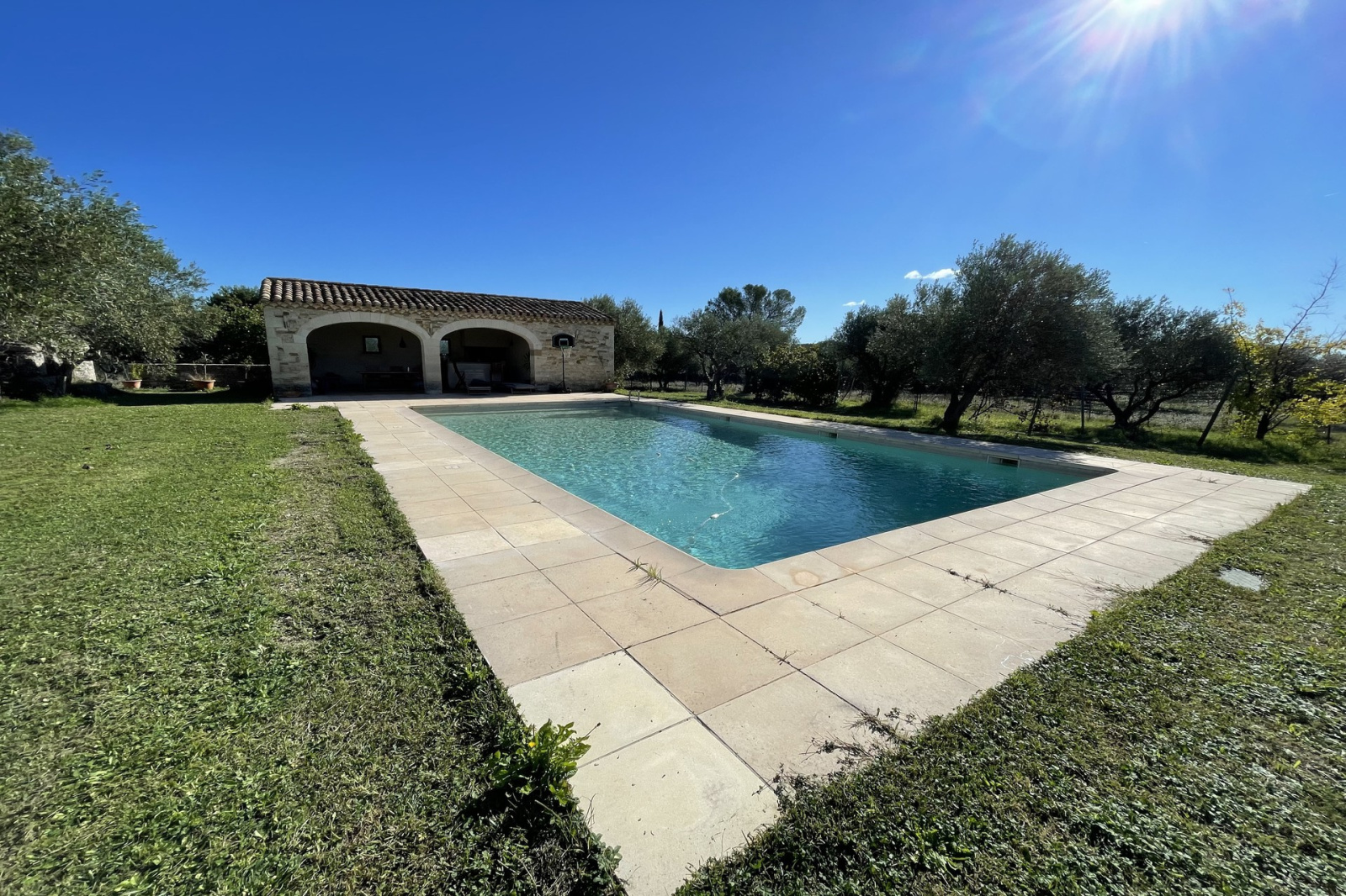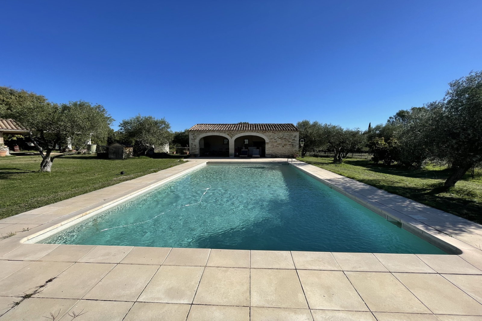 Rare à la vente et en EXCLUSIVITE ! Construite en 1996 sur un terrain de 8000m², venez découvrir cette propriété de 185m² habitables entourée de murs en pierres sèches, de chênes, et d'oliviers. En entrant côté nord, vous découvrirez un grand séjour de 48m² avec cheminée insert, une cuisine équipée séparée de 15m², une buanderie, un cellier ainsi qu'un WC. A l'étage, la partie nuit compte un bureau, un dressing, une salle de bains, un WC et 4 chambres dont une suite parentale de 27m² avec salle de bains également. Un solarium de 41m² attenant à la suite et au bureau vous offrira une vue imprenable à 180° sur la nature. En sortant sur la terrasse couverte de 55m² côté sud, vous découvrirez l'immense jardin avec piscine 12 X 6, poolhouse avec douche et WC, forage, et capitelles. Cette propriété comprend 2 garages pour une surface totale de plus de 60m². Chauffage au sol, adoucisseur d'eau et portail automatique. Ce bien est un compromis idéal pour vivre à Uzès en toute tranquillité. Consommation énergétique : 272 kw/m2/an Emission de gaz à effet de serre : 37 Co2/m2/an les honoraires sont à la charge du vendeur.