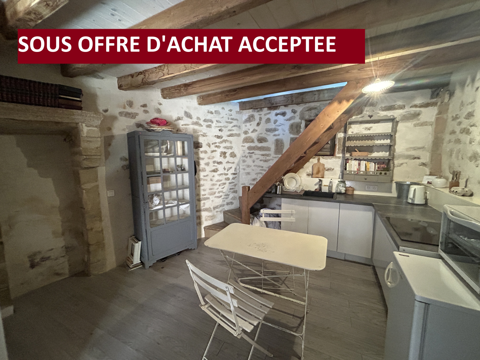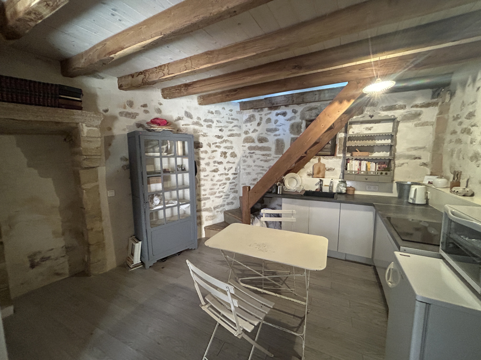 Avec coin cuisine à l'américaine. Murs en pierres apparentes.