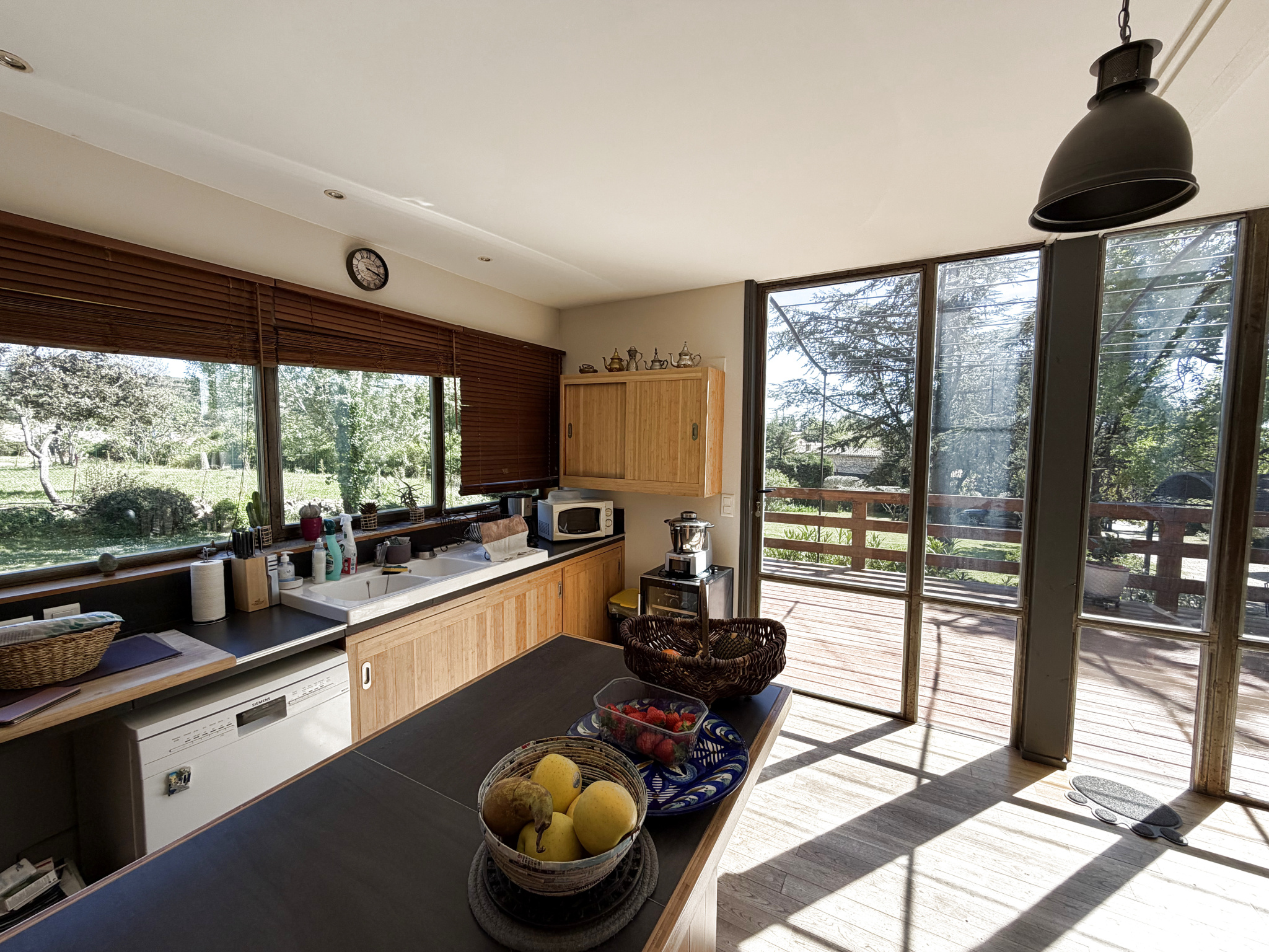 Située à seulement 7km de la cité ducale d'UZES, cette belle et surprenante construction en bois réalisée par un architecte en 2004, se veut résolument singulière et unique dans le payasge Uzètien. Implantée sur une parcelle de terrain de 1960m² avec une lègère déclivité qui lui offre une vue dégagée et imprenable sur une partie du vieux village, elle se compose en partie base d'une grande pièce de vie de plus de 40m² incluant une cuisine ouverte réalisée sur mesure avec des matériaux nobles comme le bambou. Cet espace avec de grandes surfaces vitrées en menuiseries métalliques ouvre sur une large terrasse en bois qui domine le jardin. On y accède depuis un sas d'entrée vitré. A l'étage se trouve l'espace nuit composé de 3 chambres avec une salle de bains commune. Une de ces trois chambres a le privilège d'avoir une terrasse en solarium. Des dépendances extrérieures en structure bois se compose de deux chalets de 16m² et 7m², pouvant être aisément transformés en studio indépendant.. Le terrain dispose également d'un carport pour 2 voitures. Cette habitation d'une superficie de 97m² habitables environ peut être agrandissable, et le terrain lui même situé en zone urbaine du village peut être valorisé par le biais d'une division parcellaire. Cette habitation est équipé d'un système de chauffage avec poele à granules et d'une climatisation réversible sur la partie rdc. La facade est composée d'un bardage en bois avec une isolation en laine de bois. Un espace piscine pourra être réalisé où vous le souhaitez ! Consommation énergétique : 40 kw/m2/an. Emission de gaz à effet de serre : 1 kgCo2/m2/an. Les honoraires sont à la charge du vendeur. Les informations sur les risques auxquels ce bien est exposé sont disponibles sur le site www.georisques.gouv.fr