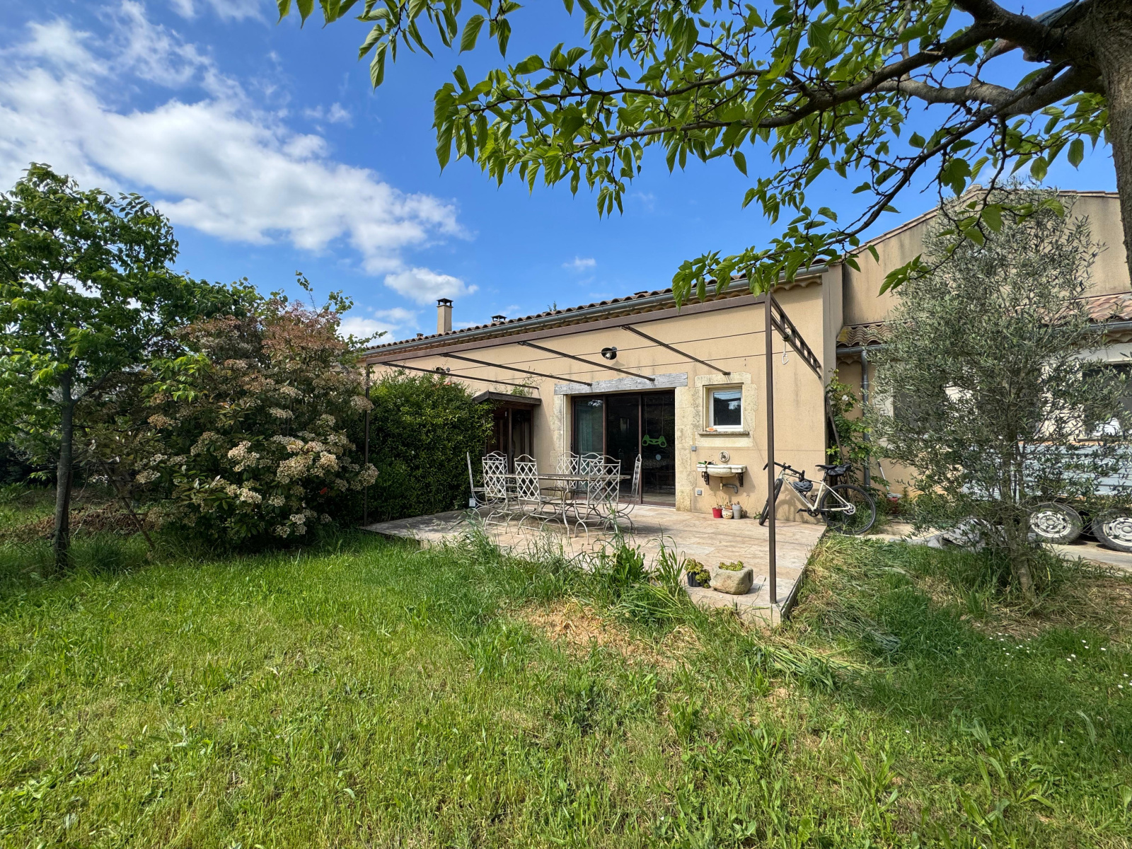NORD D'UZÈS. Belle maison de 80 m² construite en 2016, au sein d'une copropriété paisible en pleine campagne. La maison se compose d'un séjour lumineux de 35 m² avec pôele à bois, d'un bureau ou chambre de 9.50 m², d'une salle d'eau et d'un wc séparé. Au 1er étage : 4 chambres et une salle de bain. Le plus, l'habitation dispose d'un jardin d'environ 800 m² avec 2 terrases une à L'EST et la deuxième à l'OUEST. Petite copropriété avec syndic bénévole. Charges 50€/Mois. Cadre paisible et naturel, à découvrir rapidement ! Consommation énergétique : 151kw/m2/an Emission de gaz à effet de serre : 4kgCo2/m²/an Les informations sur les risques auxquels ce bien est exposé sont disponibles sur le site www.georisques.gouv.fr. Honoraires à la charge du vendeur. Ce bien vous est présenté par Grégory Vernaz agent commercial indépendant enregistré au R.S.A.C de Nîmes sous le numéro 979 178 670.